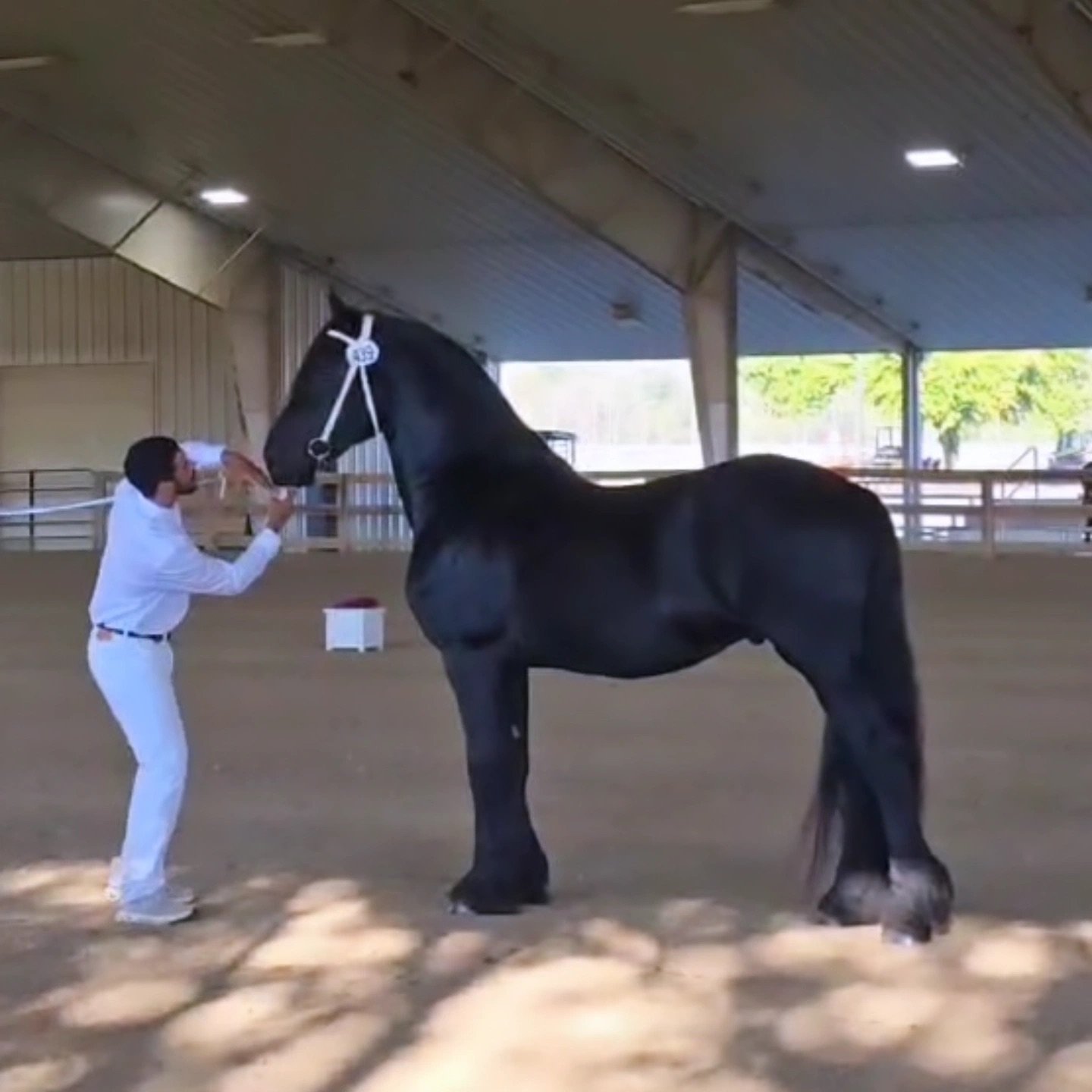 Can be gelded at the buyers expense before leaving. He has a gelding personality as a stallion but he does not go into fields with other horses he has his own paddock, He can be stalled next to mares and babies and is a complete gentleman. He can stand next to mares and walk pass them in the barn without acting like a complete fool. I can leave his stall door open and he won’t walk through it. He is very well mannered.